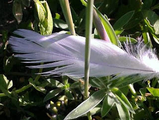 the whispies, there in the grass, a solid white feather surrendered herself.